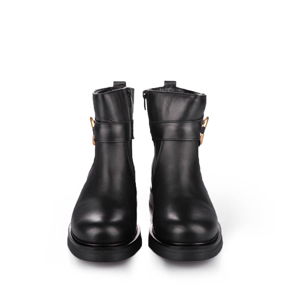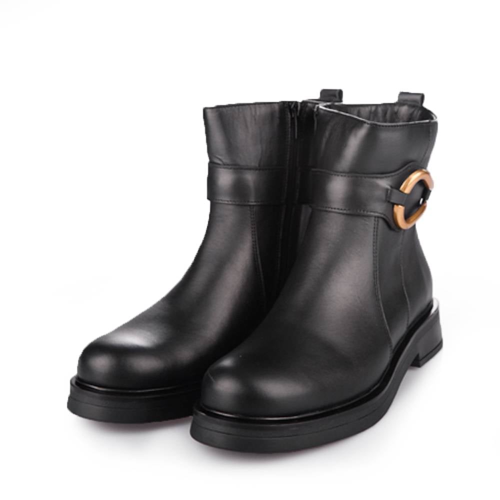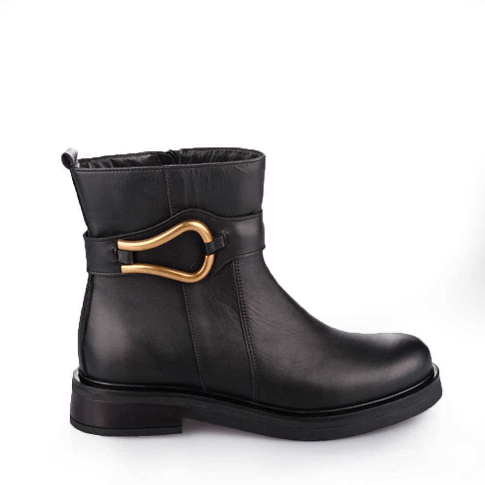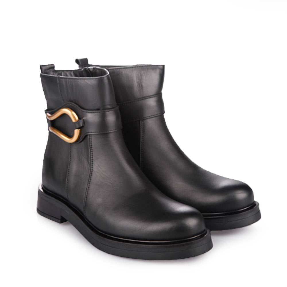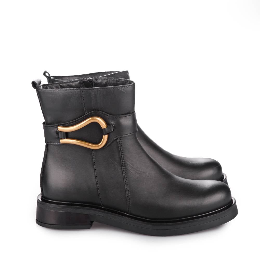 Μποτάκι δερμάτινο γυναικείο αστραγάλου, σε μαύρο χρώμα με φερμουάρ εσωτερικό και διακοσμητική αγκράφα.