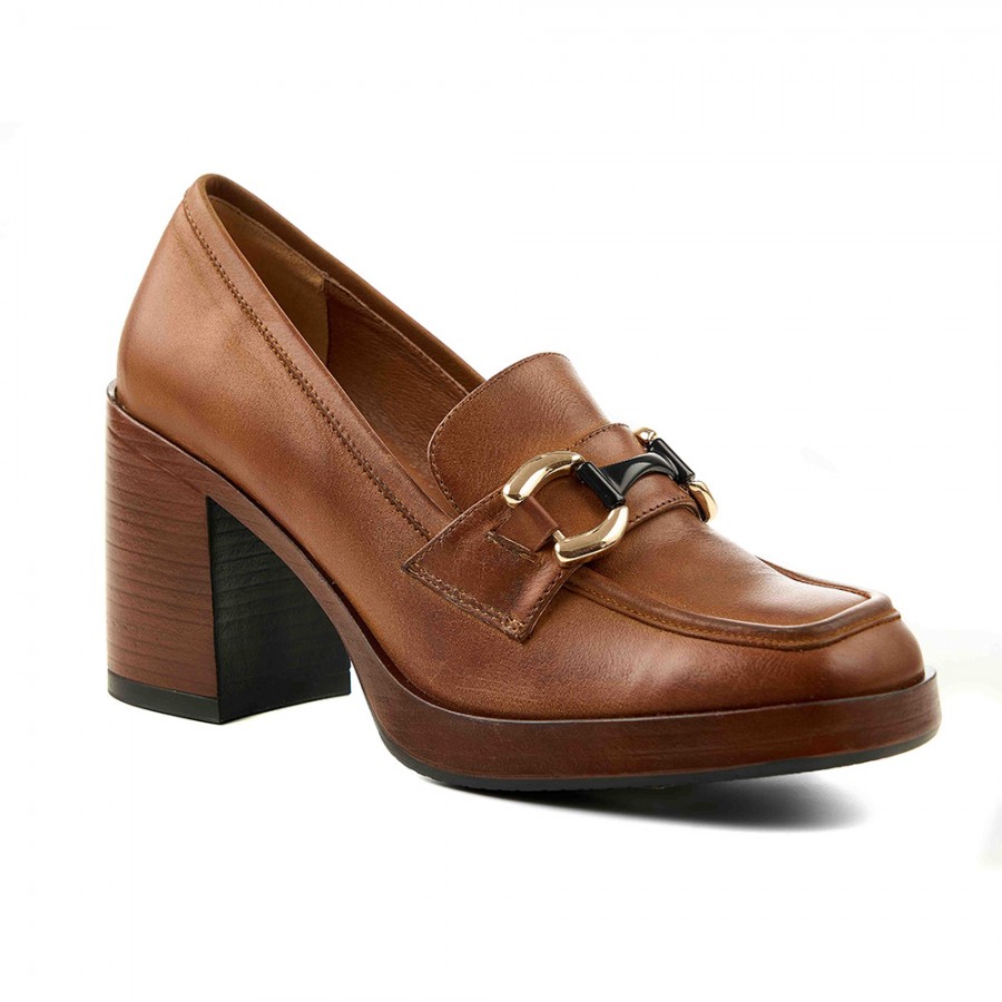 Δερμάτινο loafer σε ταμπά χρώμα με τακούνι και μεταλλικό διακοσμητικό σε μαύρο και χρυσό.