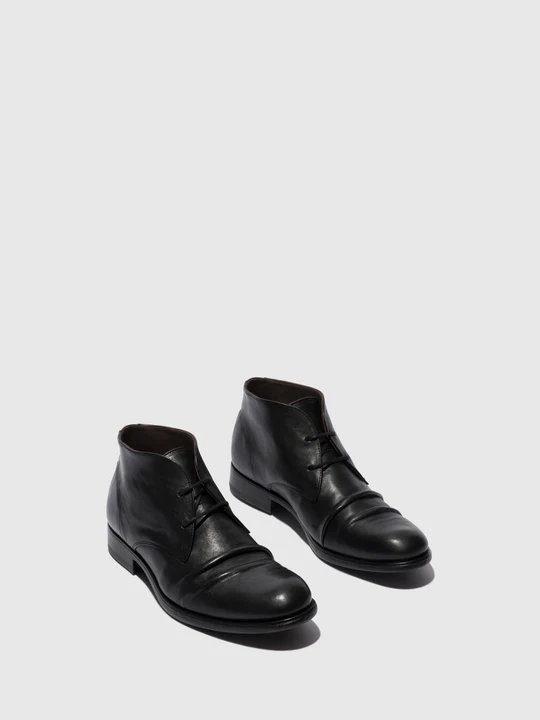 Ανδρικό δερμάτινο μποτάκι της εταιρείας FLY LONDON σε μαύρο χρώμα με κορδόνια.